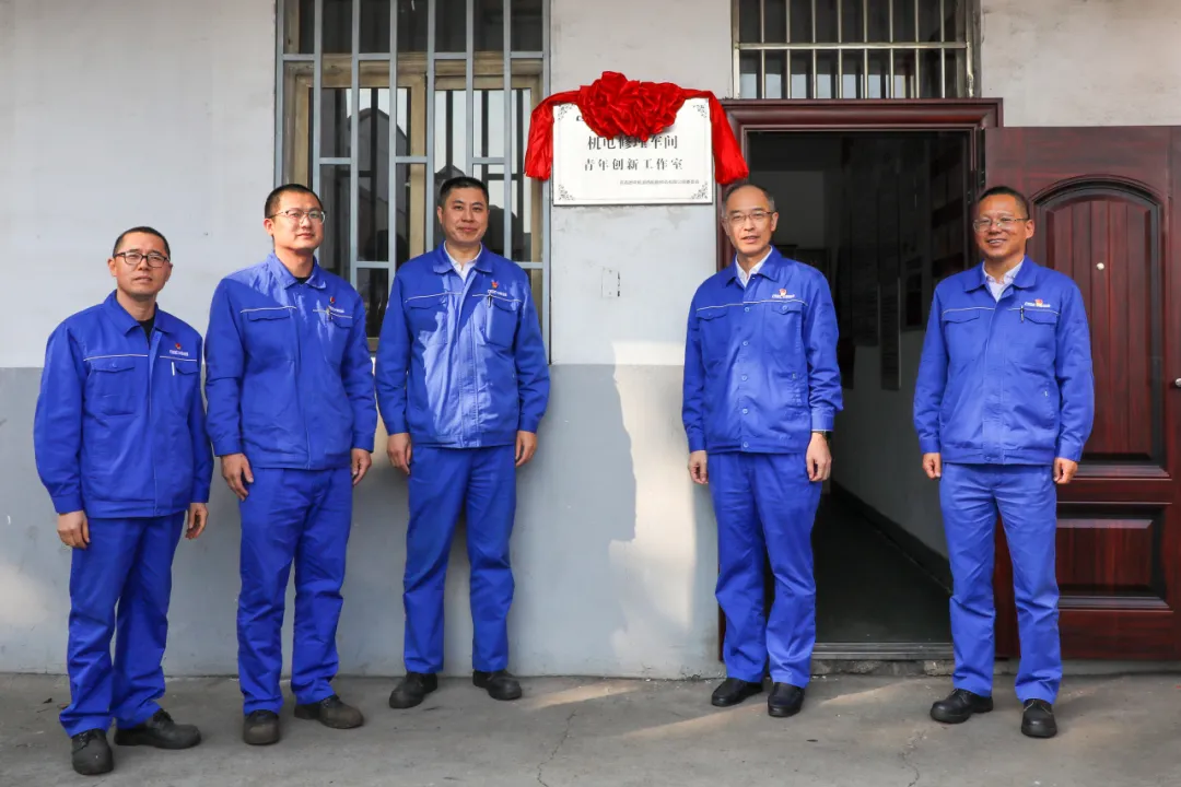 隨后,陸子友赴機電修理車間,為青年創(chuàng)新工作室揭牌,并聽取了工作室的介紹與項目進展情況。